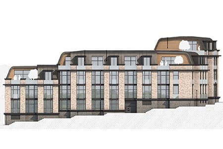 Применение различных горизонтальных и вертикальных членений на фасаде призваны избежать массивности и монотонности в решении силуэта.